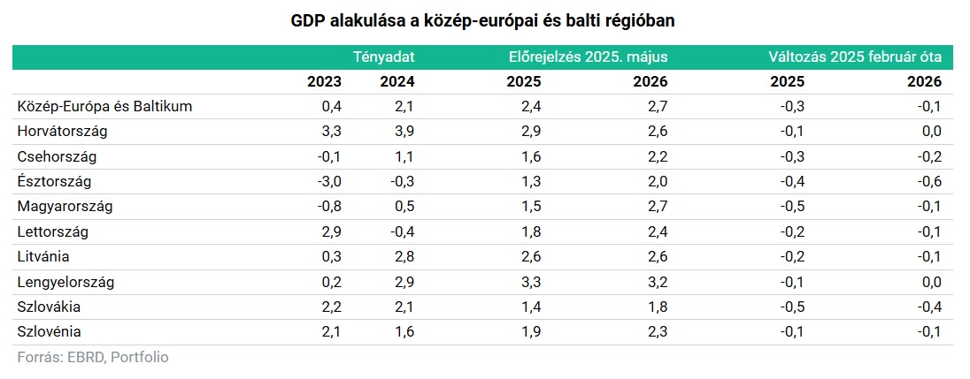 Mindeközben a minket is tartalmazó közép-európai és balti régióban az elemzés átlagosan 2,4%-os GDP növekedést vetít előre. Ez 0,3% százalékponttal kisebb, mint a legutóbbi, februári jelentésükben a térségre vonatkozó várakozás. A változtatást a vámok hatásának figyelembe vétele mellett főként a gyenge német kereslet indokolta.