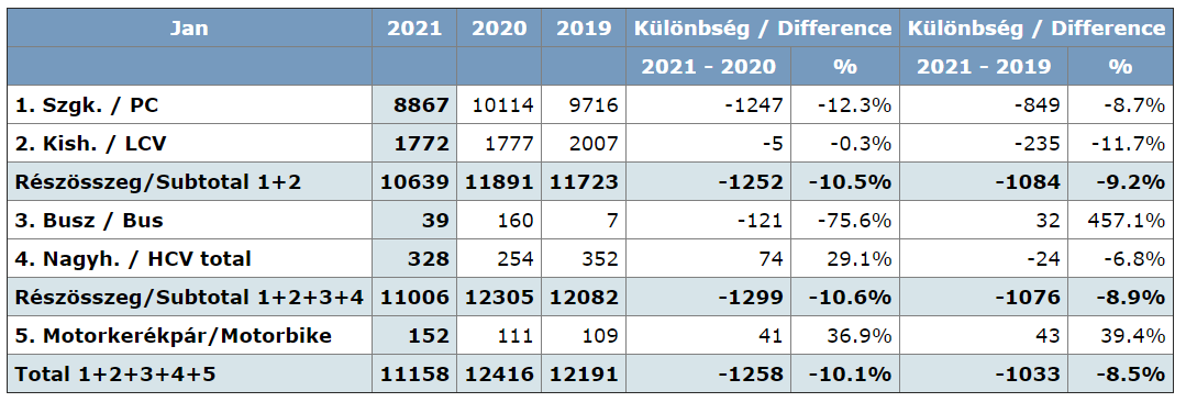 Hátrányból kezdte a 2021-es évet az új járművek piaca. Az év első hónapjában alig több mint 11 ezer jármű (autó, furgon, teherautó, busz és motor) kelt el, ami 10 százalékos hanyatlást jelent tavaly januárhoz viszonyítva. Bár tovább szűkül a teljes piac, a 2020-as 18 százalékot meghaladó visszaesésnél valamivel kedvezőbb eredmény született.