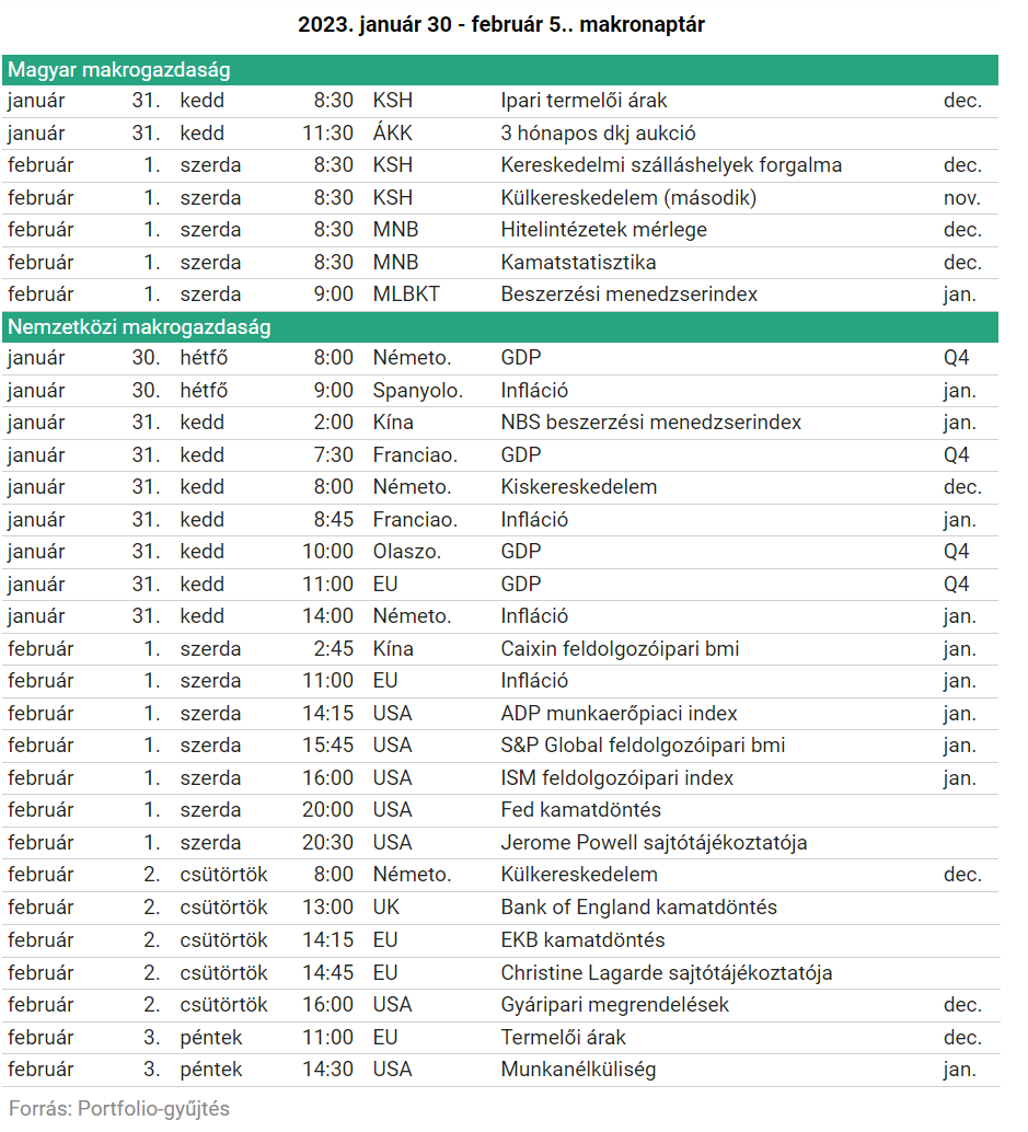 Várhatóan szerda reggel jelenik meg a magyar feldolgozóipar friss beszerzési menedzserindexe, a KSH pedig a külkereskedelem részletes adatai mellett a kereskedelmi szálláshelyekre vonatkozó decemberi statisztikát közli. Az MNB a szokásos havi adatokat publikálja a hitelintézetek mérlegéről, valamint a vállalati és lakossági kamatokról. Azonban külföldön ez a nap is izgalmasabb lehet, hiszen a bmi-k mellett jön az amerikai magánszektor foglalkoztatását jelző ADP-index, este pedig a hét egyik legfontosabb eseménye, a Fed kamatdöntő ülése. A várakozások szerint az amerikai infláció csökkenésére az eddiginél kisebb, 25 bázispontos további emeléssel reagálhat a jegybank, de a befektetők árgus szemmel figyelhetik a közlemény hangvételét, illetve Jerome Powell szokásos sajtótájékoztatóját is.